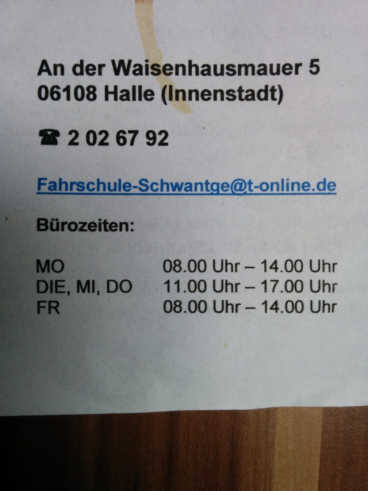 Die Fahrschule A.Schwantge an der Waisenhausmauer in Halle kann ich nur weiterempfehlen! Das gesamte Team ist freundlich, professionell und sehr geduldig. Der Theorieunterricht war gut strukturiert und nie langweilig.